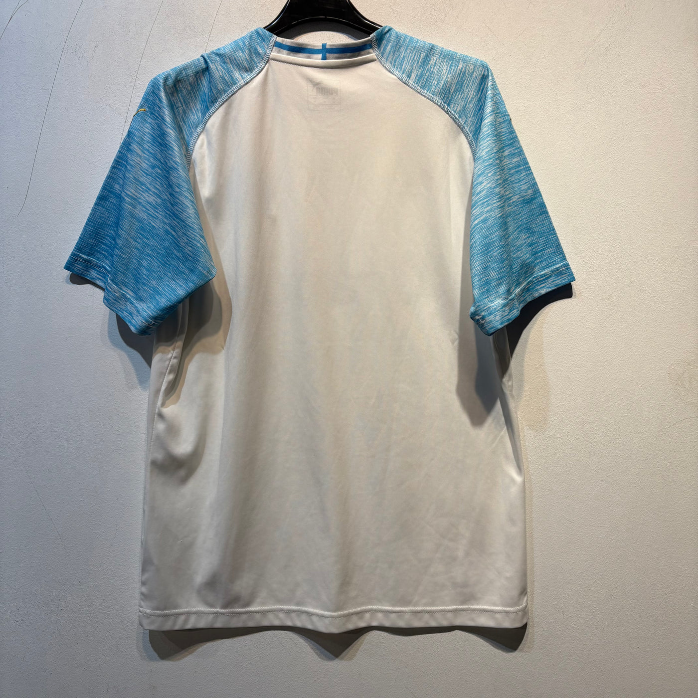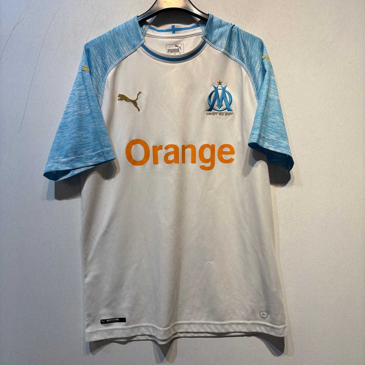 Official Olympique de Marseille 2018/19 home shirt manufactured by Puma. Classic white base with textured sky-blue raglan sleeves and gold detailing. Features the iconic OM crest with star, Orange sponsor, and Puma DryCELL technology. Size Medium.