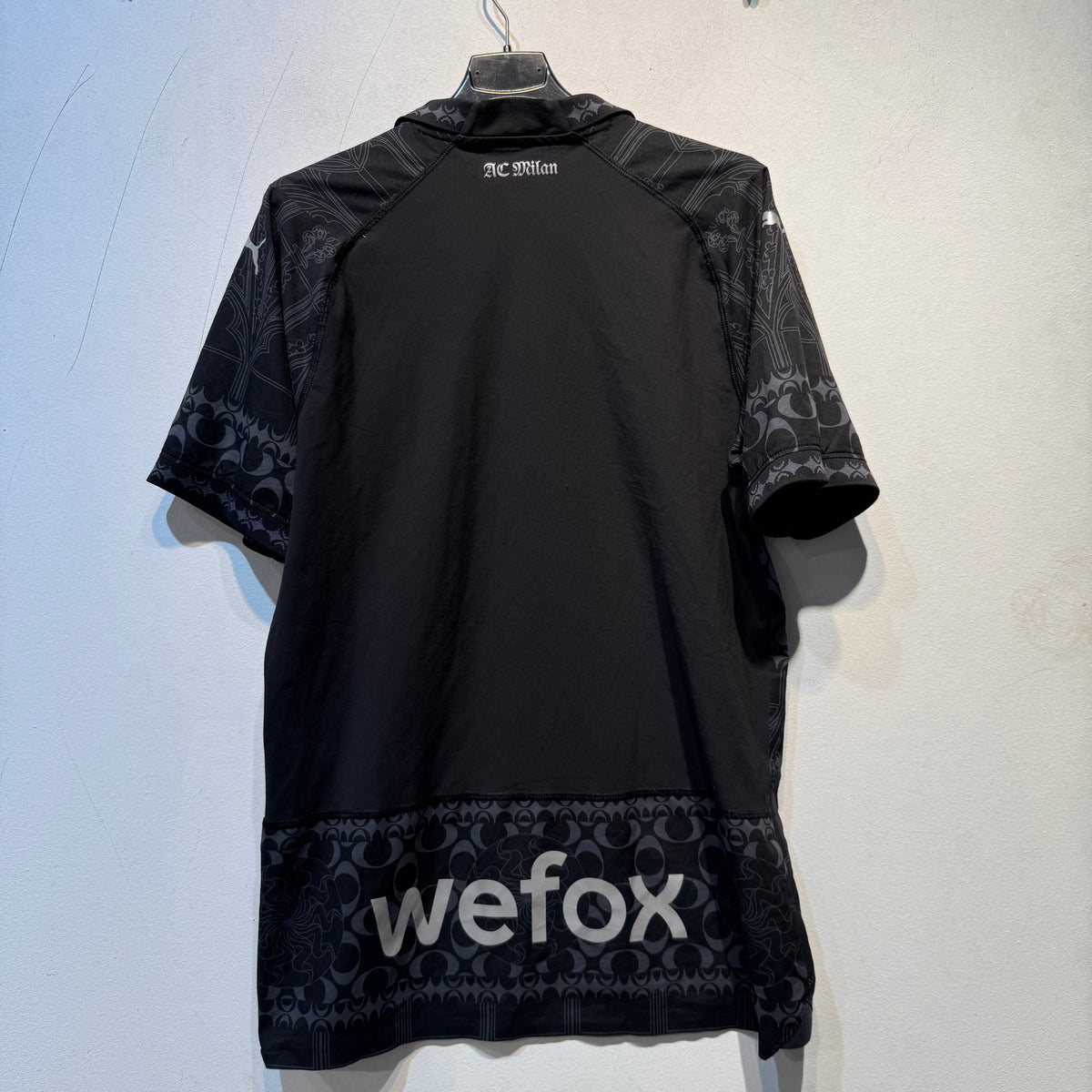 Authentic AC Milan 2022/23 away shirt by Puma. Features the black gothic all-over pattern, official club crest with single star, Emirates Fly Better sponsor, wefox rear sponsor, and Puma Authentic Licensed Football patch. Blank jersey with no name or number. Size Medium.