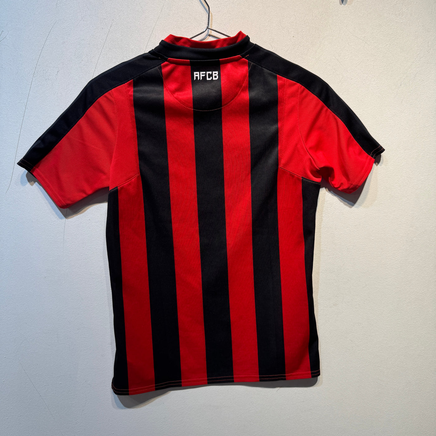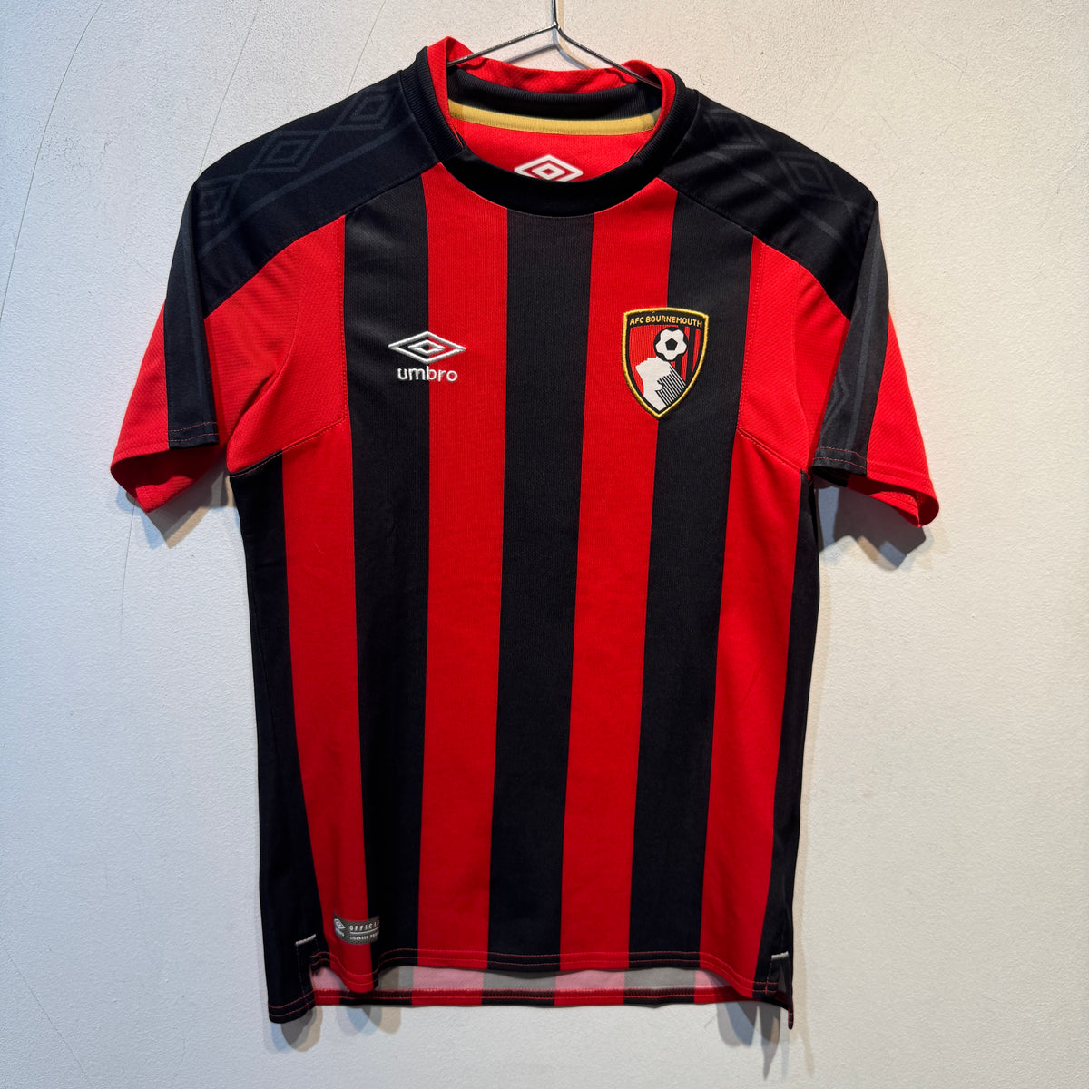 Official AFC Bournemouth 2020/21 home shirt by Umbro. Classic red and black vertical stripes with tonal diamond shoulder detailing and embroidered club crest. Worn during the club’s Championship campaign. Youth Medium (146cm) sizing.